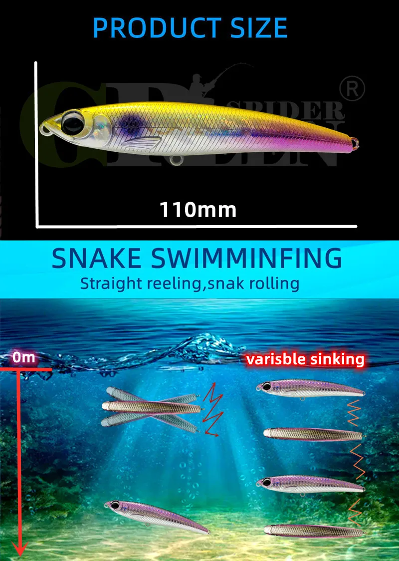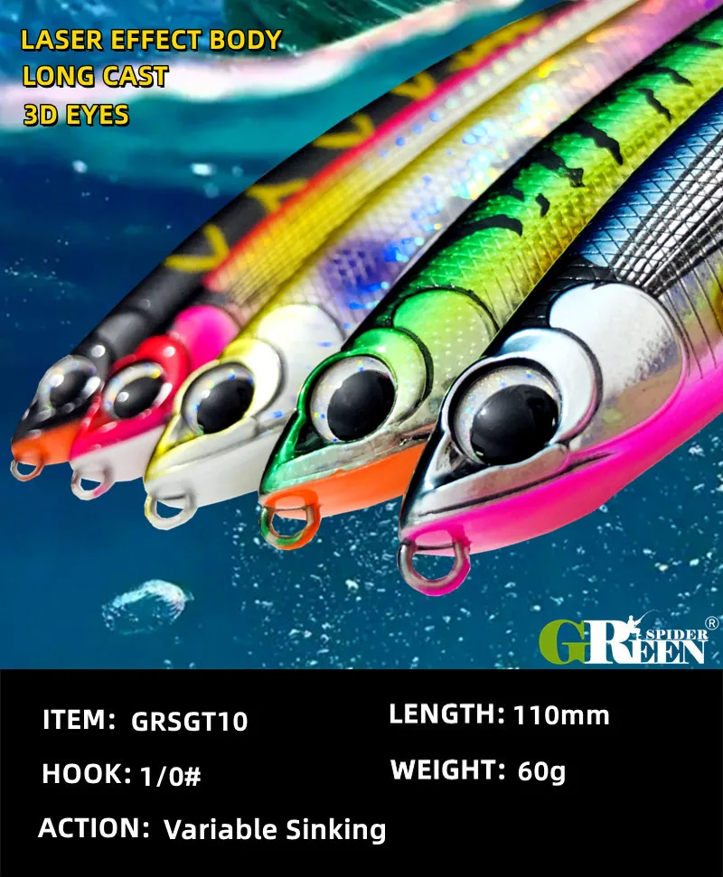 The 110mm 60g Sinking Pencil Lure is designed for serious anglers targeting big game species like GT and tuna. Crafted with precision, this hard bait mimics the natural movement of distressed prey, making it irresistible to predators.