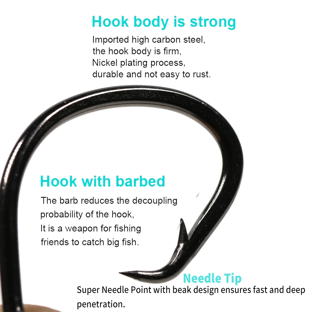 Feature:4X heavy wire, barbed, claw tip, Forged shank, offset point. Black nickel,saltwater resistant, big eye,top grade high-carbon steel hooks chemically sharpend and polished by experienced workers.